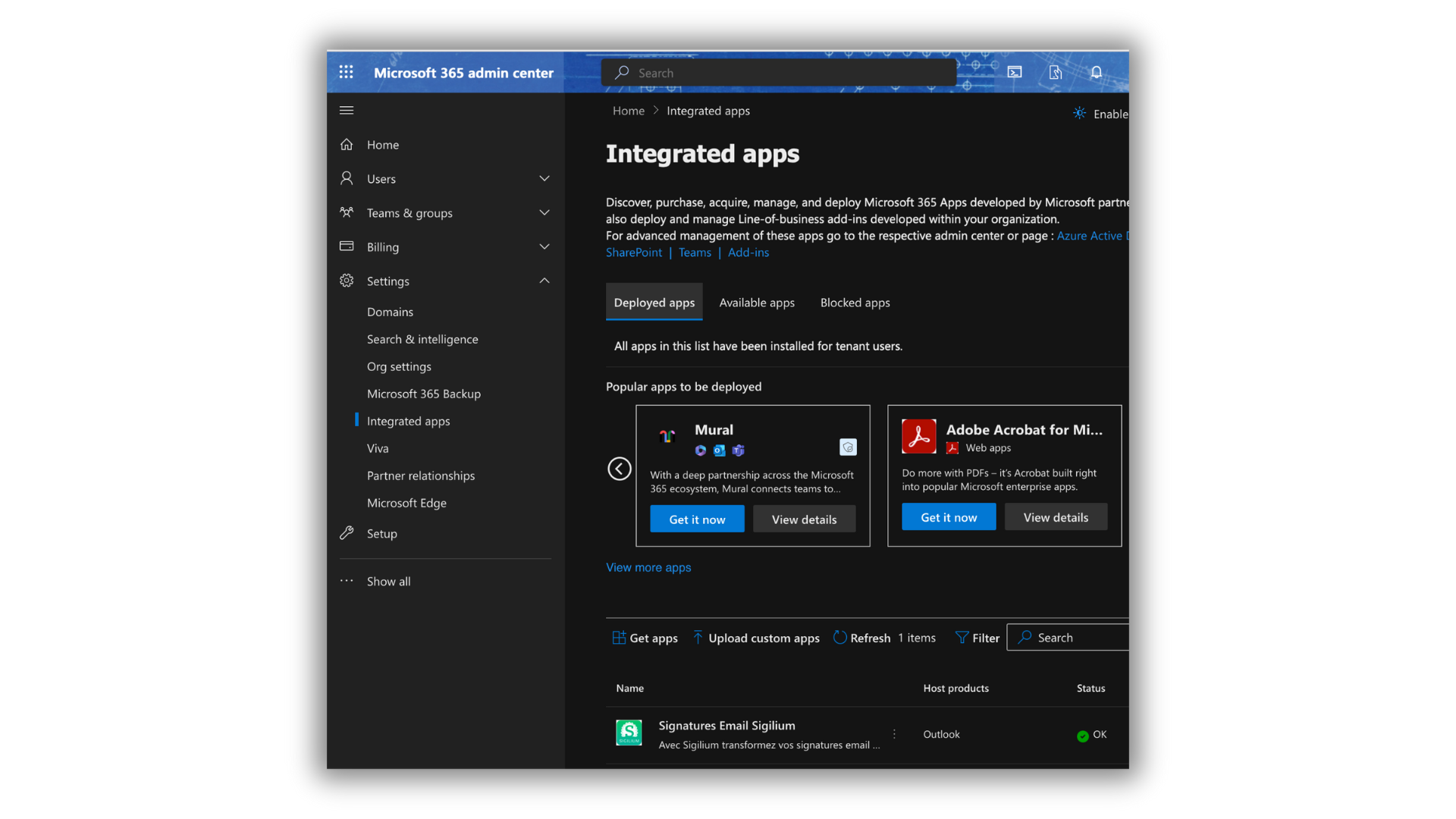 - Rendez-vous à cette adresse : https://admin.microsoft.com/#/Settings/IntegratedApps