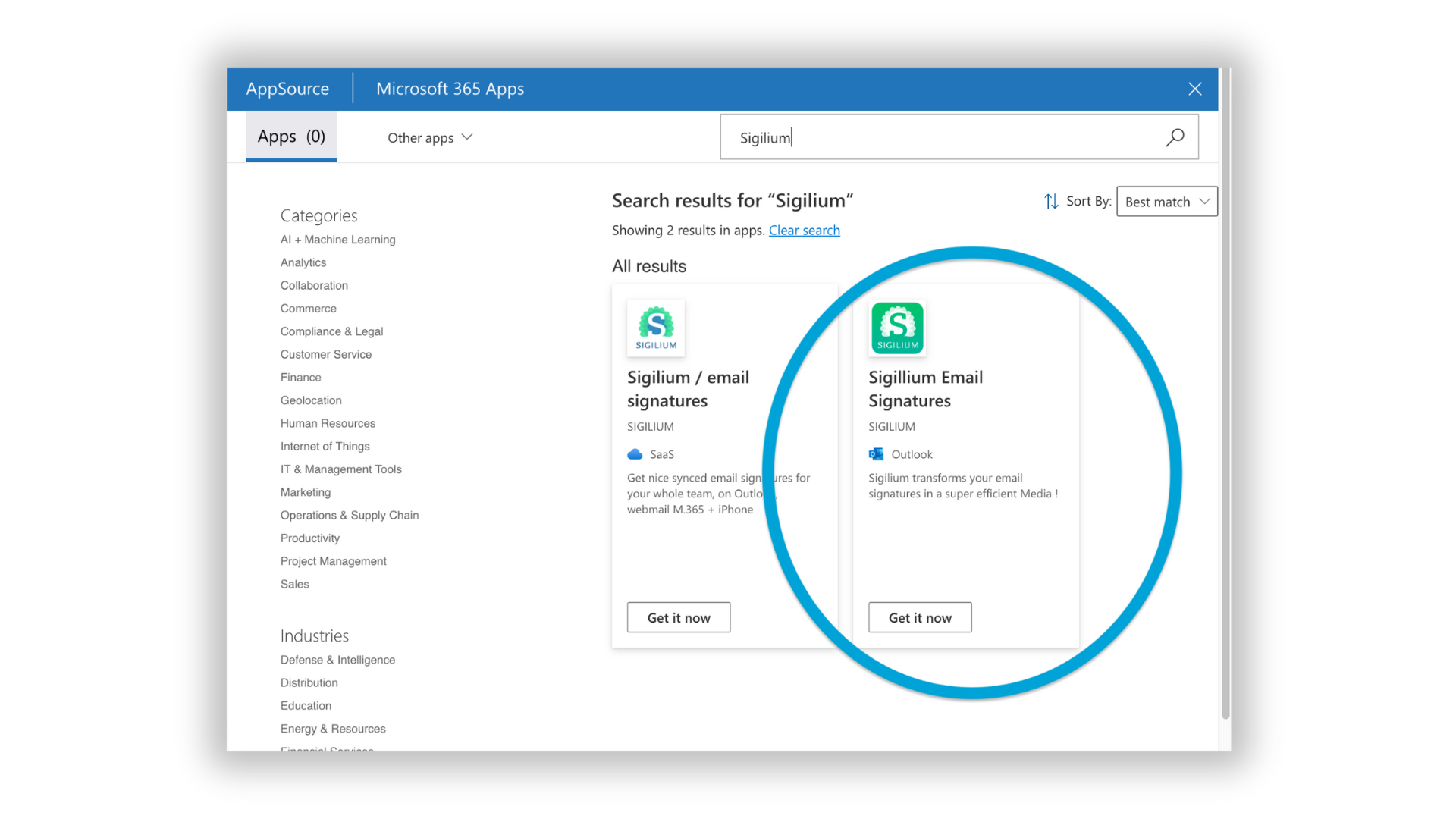 6 . Cherchez Sigilium et Cliquez sur la version Outlook