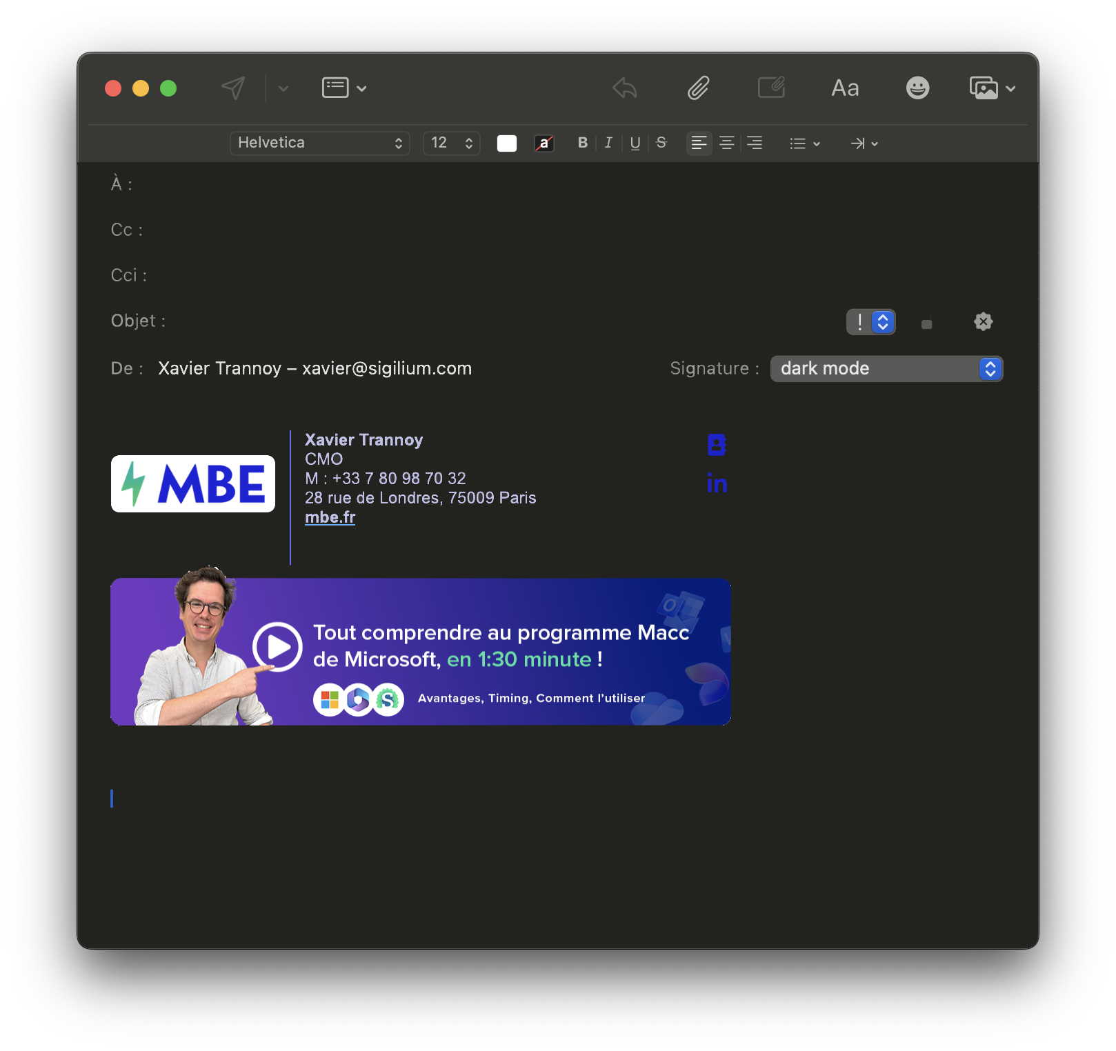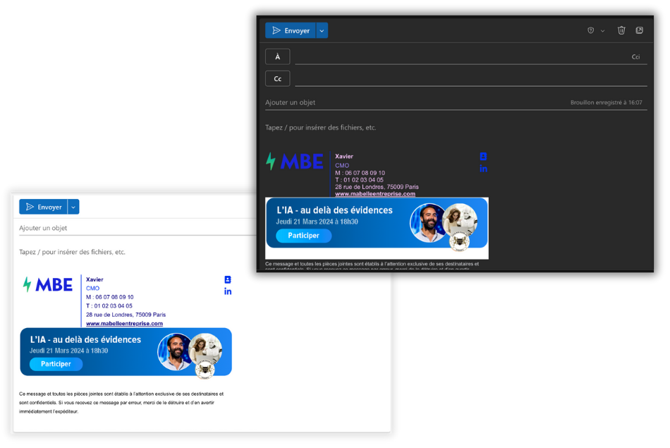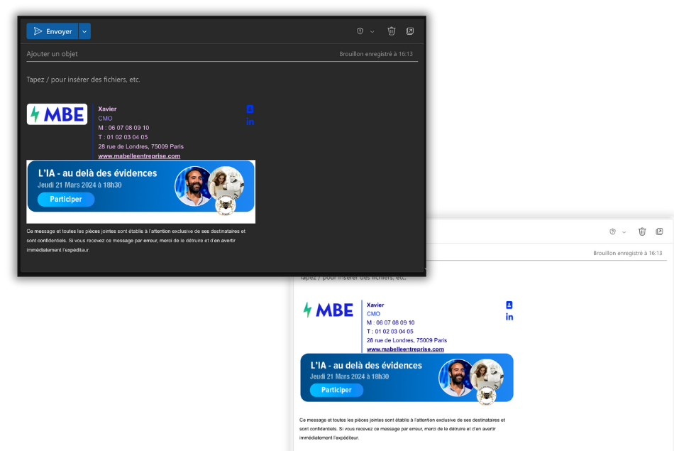 - Exemple : des coordonnées en noir ((#000000) seront automatiquement détectées par la messagerie et adaptées en blanc lorsque le dark mode est activé.