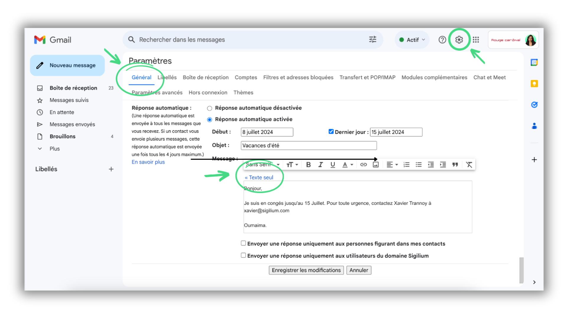 Afficher sa signature dans les messages d'absence (en réponse automatique) sur Gmail